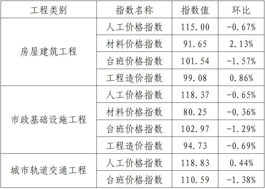 現(xiàn)將2026年1月我省房屋建筑工程、市政基礎設施工程人工價格指數(shù)、材料價格指數(shù)、臺班價格指數(shù)及工程造價指數(shù),以及城市軌道交通工程人工價格指數(shù)、臺班價格指數(shù)發(fā)布如下: