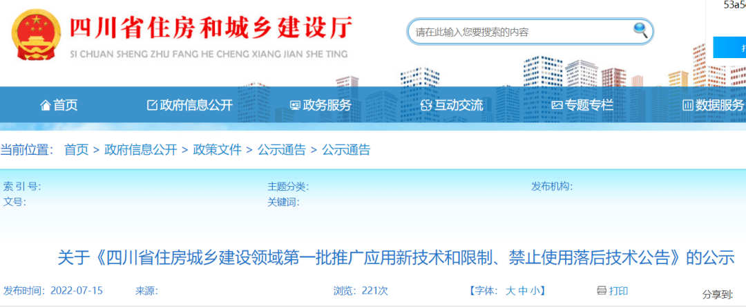 根據(jù)《四川省住房城鄉(xiāng)建設領域新技術推廣應用管理辦法(試行)》(川建行規(guī)〔2022〕4號)相關要求,按規(guī)定完成公開征集、專家評審等程序,擬將以下技術列入《四川省住房城鄉(xiāng)建設領域推廣應用新技術和限制、禁止使用落后技術公告(第一批)》,現(xiàn)予以公示,公示期5個工作日(2022年7月15日至7月21日)。公示期內(nèi),任何單位和個人如對公示內(nèi)容有異議,可通過電話、書面方式向勘察設計與科學技術處聯(lián)系。