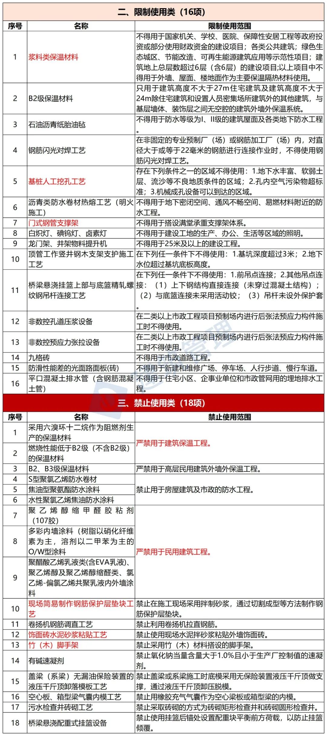 共13項限制類施工工藝、設備和材料