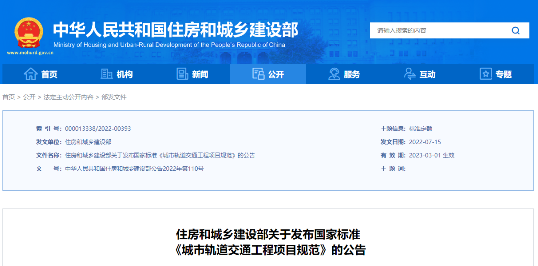 | 《城市軌道交通工程項(xiàng)目規(guī)范》GB 55033-2022 | https://www.mohurd.gov.cn/gongkai/fdzdgknr/zfhcxjsbwj/202208/20220825_767715.html | 2023年3月1日 |