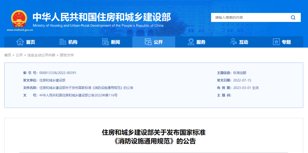 | 《消防設(shè)施通用規(guī)范》GB 55036-2022 | https://www.mohurd.gov.cn/gongkai/fdzdgknr/zfhcxjsbwj/202208/20220824_767704.html | 2023年3月1日 |
