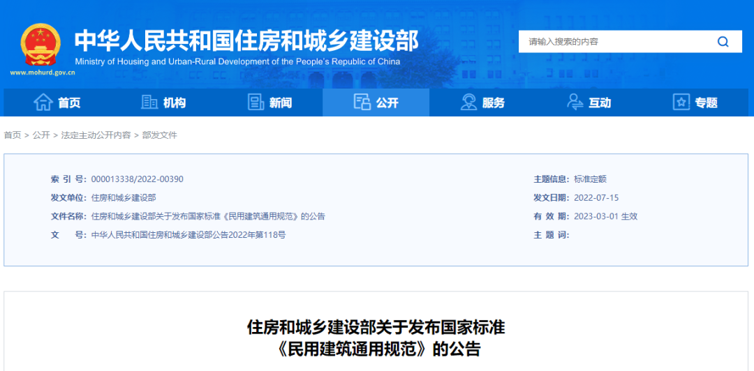 | 《民用建筑通用規(guī)范》GB 55031-2022 | https://www.mohurd.gov.cn/gongkai/fdzdgknr/zfhcxjsbwj/202208/20220824_767703.html | 2023年3月1日 |
