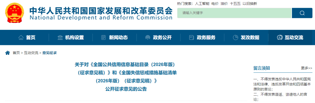 近日,國(guó)家發(fā)展改革委發(fā)布《關(guān)于對(duì)〈全國(guó)公共信用信息基礎(chǔ)目錄(2026年版)(征求意見稿)〉和〈全國(guó)失信懲戒措施基礎(chǔ)清單(2026年版)(征求意見稿)〉公開征求意見的公告》(簡(jiǎn)稱《公告》)。